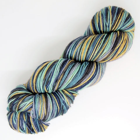 One skein on my hardy Slash Self-Striping Sock base in stripes of black, turquoise, mint, navy, gold, and gray, each stripe being about 5-6 rows, depending on your gauge.