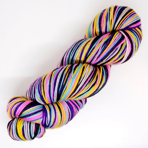 One skein on my hardy Slash Self-Striping Sock base in stripes of dark purple, pinurple, black, aqua, yellow, and light gray, each stripe being about 5-6 rows, depending on your gauge.